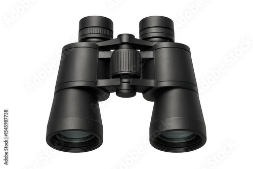 Black binoculars resting on transparent surface, enabling detailed viewing of faraway landscapes with sharp optical performance