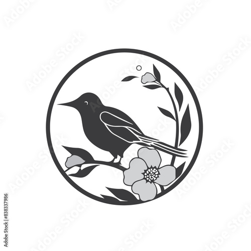 Black bird, leaf and flower vector silhouette illustration,