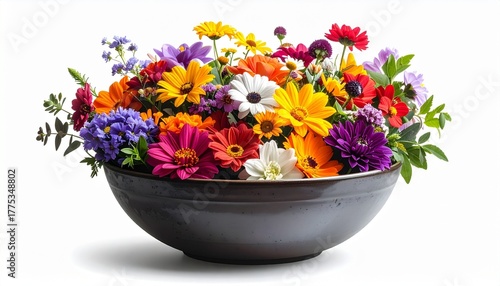 Black bowl filled with colorful blooming flowers on light surface for editorial floral photography botanical design and poetic nature-themed visuals