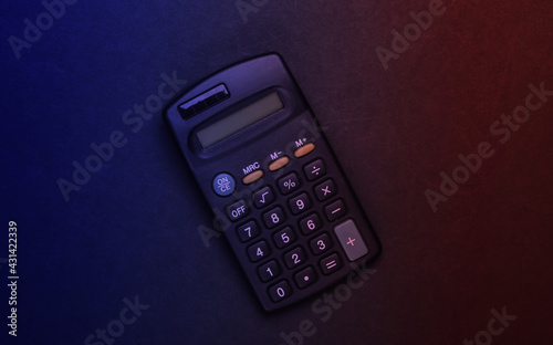 Black calculator in red blue neon light. Top view