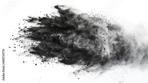 Black chalk pieces and dust particles fly, creating an exploding effect, isolated on white.