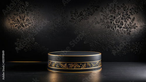 Black Christmas product display podium, Black Empty Flat horizontal cylindrical product stand with product presentation space, Black podium for Christmas display on black background