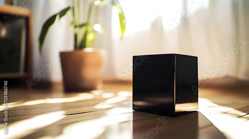 Black Cube Object On Wooden Floor In Sunny Room
