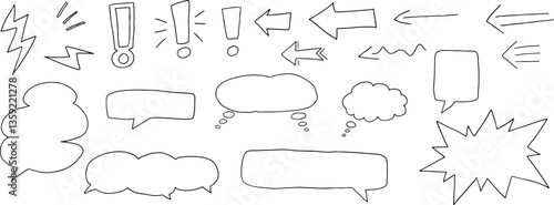 black curved line drawn figures silhouettes speech bubbles, thought bubbles, lightning, explosion, doodles, exclamation marks hand drawn. Isolated elements.
