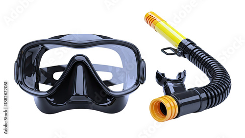 Black Diving Mask and Yellow Snorkel on White Background