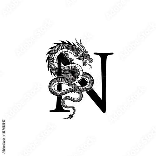 Black dragon coiled around a stylized letter N on white background serpent mythical creature