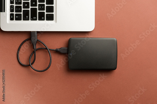 black external hard drive, partial laptop view, brown background, office concept.top view