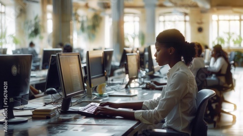 black female at office desk, multiple workstations with computers placed on each, several workers are busy working, student studying