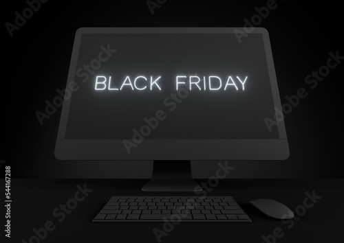 Black Friday white glowing neon text on a computer. horizontal banner, design template, copy space, creative background. 3D illustration, 3D design