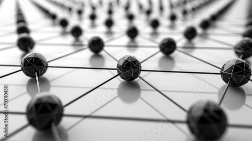 Black Geometric Spheres Interconnected on a Grid, Creating a Three-Dimensional Network Resembling Molecular Structure. Generative AI