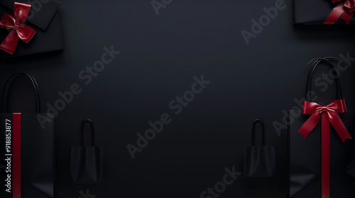 Black gift bags with red ribbons are neatly arranged on a dark surface, creating an elegant display for a special occasion, copy space, black friday mood