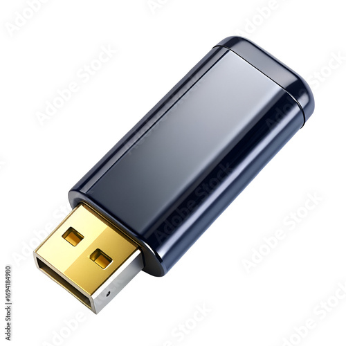 Black glossy usb flash drive with gold connector, isolated on transparent background