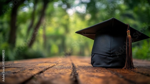 Black Graduation Cap with Tassel on Table, Blurred Green Background, Education Concept