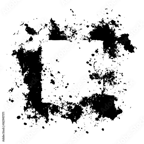 Black grunge frame with splatters creating a square shape around a white space in a distressed style