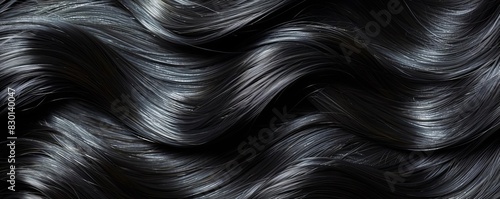 Black hair background, closeup of shiny wavy texture Hair texture for beauty and cosmetic design Black hair pattern High resolution Realistic photography