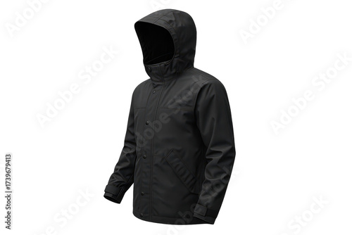 Black hooded raincoat isolated on a transparent background, perfect for edits.