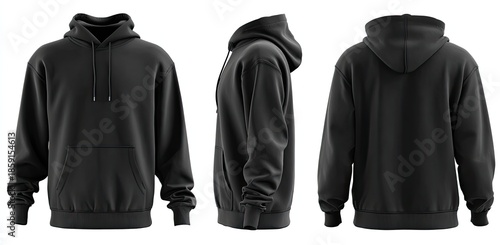 Black hoodie mockup front, side, and back views, showcasing design