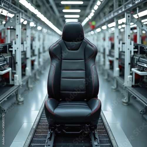 Black leather car in car factory on assembly line. Automotive production interior design. Auto industry shows modern manufacturing process. Conveyor belt at plant.