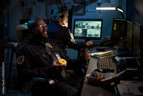 Black man wearing security uniform sitting at desk eating donut and holding coffee cup while working night shift with Caucasian woman monitoring surveillance screens