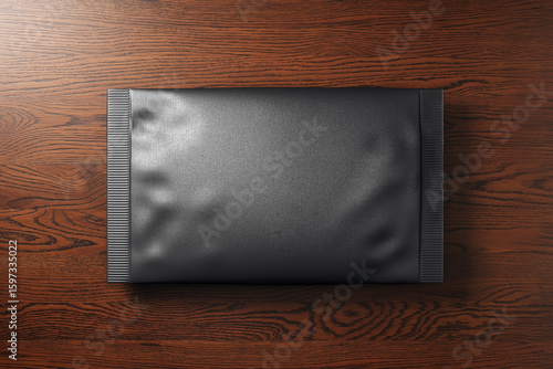 Black matte plastic pouch mockup placed centrally on dark brown wooden background for product branding design presentation and advertising template. 3D Rendering
