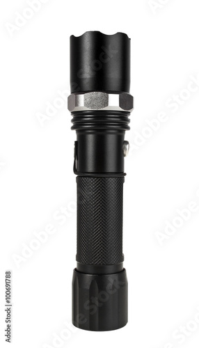 Black metallic flashlight isolated on white background