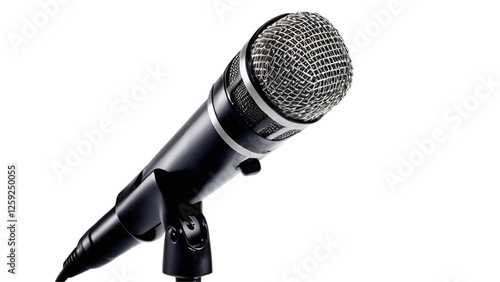 Black microphone with a silver grille perfect for music studio recording, podcasting, live performances, and professional speeches on stage.