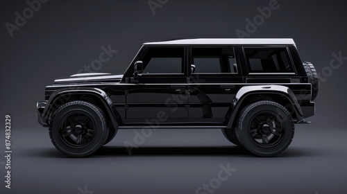 Black modern SUV with a sleek and robust design is parked on a flat surface. The vehicle's shiny exterior and detailed features highlight its sturdy build and stylish appearance.