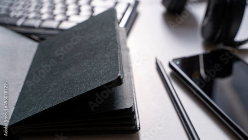 Black objects on a white background. notebook, headphones, keyboard and mobile phone