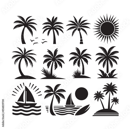 Black palm trees set isolated on white background. Palm silhouettes. Design of palm trees for posters, banners and promotional items. Vector illustration
