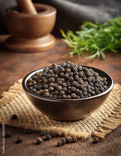Black pepper or peppercorns in bowl