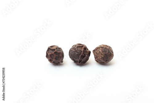 Black peppercorns on white background. Organic spice. Dry black pepper grain.
