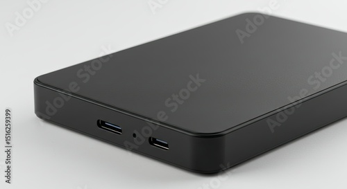 Black rectangular device showing two ports on its front edge resting on a white surface