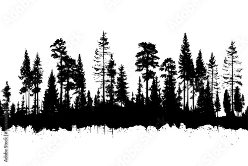 black silhouette of a forest of pine trees on a white background black, forest, ink, pine tree, silhouette, tree, wood , Generative art.