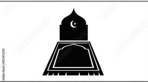 Black silhouette of a mosque with a crescent moon and star on a prayer mat on a white background for islamic or ramadan themes with religion