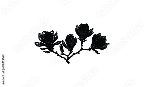 Black silhouette of blooming magnolia flowers. Vector retro hand drawn illustration