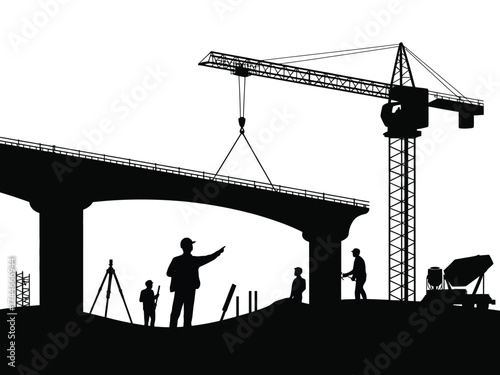 Black silhouette of construction workers building a bridge with crane engineering