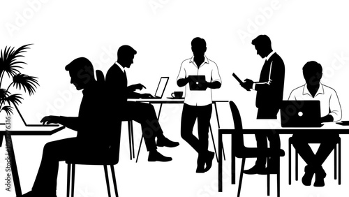Black silhouette of people working in a modern office setting with laptops and a plant, conveying a busy business atmosphere.