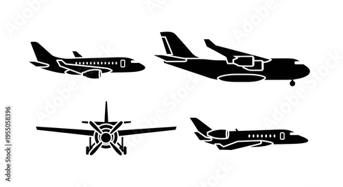 Black silhouettes of airplanes in different views