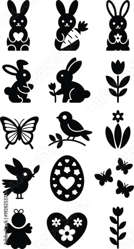 Black silhouettes of Easter icons with bunnies, eggs, and flowers