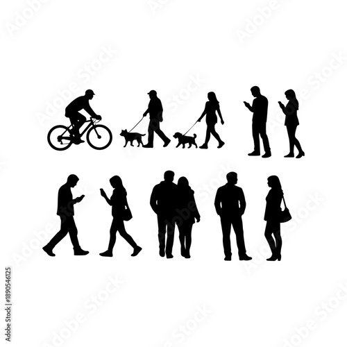 Black silhouettes of people walking, cycling, and standing set isolated on white background.