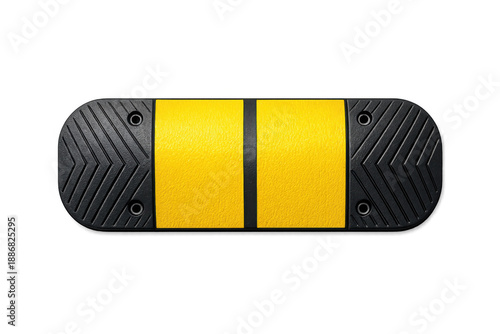 Black speed bump with yellow stripes and chevron pattern on black background