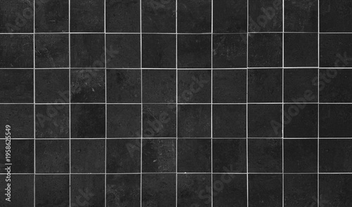 Black square ceramic tile wall background with white grout lines, modern dark bathroom or kitchen interior stone texture pattern, minimalist architecture backdrop for design and copy space.