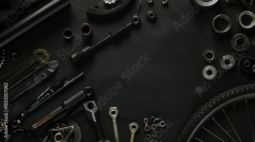 Black Table Composition: Bicycle Hardware and Essential Tools Ready for Use