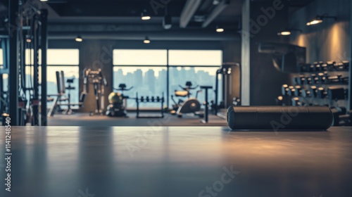 Black table top with gym background for product. Empty countertop mockup for sports nutrition or equipment.