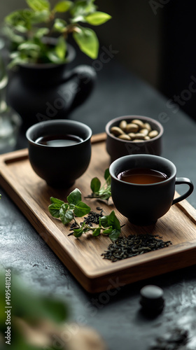 Black tea in black cups on a wooden tray with leaves and a Chinese medicine mug.
