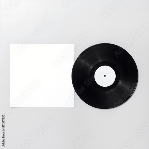 Black vinyl record with blank white cover sleeve on light background, top view of retro music media for branding or mockup use