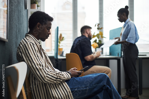 Black young man sitting and using smartphone in bank office reception area while waiting in queue for service, Caucasian man and Black female clerk talking at desk background