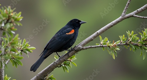 Blackbird perched on branch with green leaves in natural setting