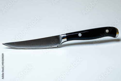 Black-handled knife on white surface.