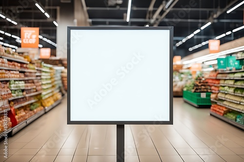 Blank advertising mockup stands within an supermarket setting , blurred background , showcasing a wide banner design featuring ample blank .space for your content design.